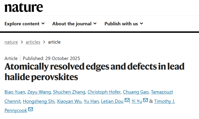 近日,九游体育(www.jiuyou.com)官方网站物质科学与技术学院于奕课题组与比利时安特卫普大学、美国普渡大学科研团队合作,在辐照敏感材料的电子显微成像研究中取得突破性进展,利用低剂量电子显微成像方法揭示了卤化物钙钛矿材料的表面边缘和内部缺陷的原子结构。北京时间10月29日,相关研究成果以“Atomically Resolved Edges and Defects in Lead Halide Perovskites”为题,在线发表于国际学术期刊《自然》(Nature)。