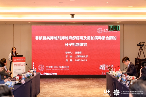 在终审答辩中,王逸儒以病毒基因组复制、转录调控机制及抗病毒药物的开发为研究方向,汇报了她在非核苷类抑制剂抑制麻疹病毒和尼帕病毒RNA聚合酶复合物活性的分子机制方面的最新研究成果。其扎实的科研功底与清晰的表达获得了专家们的高度认可和评价。经多轮严格评审,她一路过关斩将,最终从全国多所高校、两百余名青年学者中摘得二等奖。