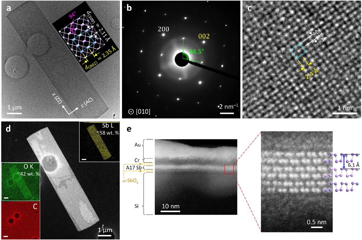 黑磷烯作为典型的各向异性二维单层材料,其褶皱蜂窝结构中3p轨道沿面内锯齿方向与扶手椅方向的杂化存在显著差异,赋予其电学与热学传导各向异性,该材料早在1953年即证实具有高载流子迁移率,是一种优异的纳米电子材料。锑作为同属第Ⅴ主族元素,A17相黑锑烯具备类似的各向异性特征,其5p轨道杂化引入强自旋轨道耦合效应,理论上具有更优越的电学输运性能,被认为是未来电子与能源器件的理想候选之一。然而,由于A17相黑锑烯晶体是一种亚稳态,其可控外延生长始终面临挑战。