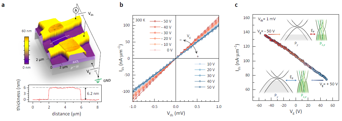 图2. 背栅场效应器件验证多层黑锑烯的电学性能。