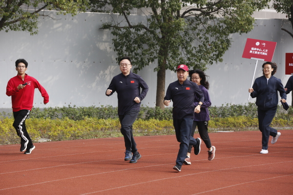 校长封东来宣布运动会开幕,为健康跑鸣枪。校领导丁浩、江舸、崔勇为健康跑领跑。