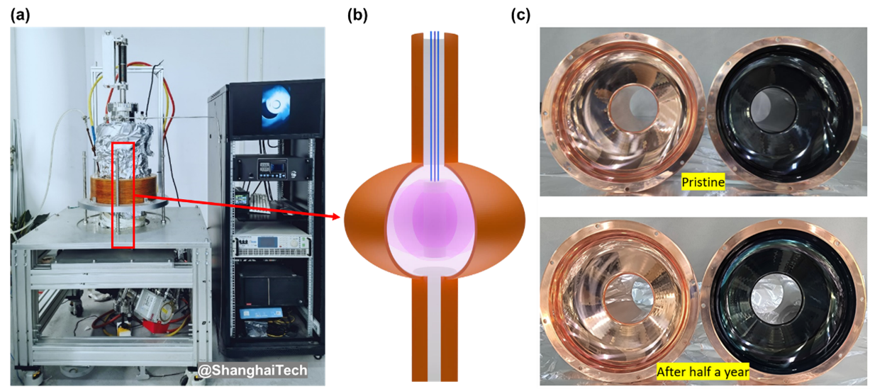 1. (a) HiPIMRS装置。(b) 铜腔内部高能脉冲磁控溅射工作示意图。 (c)1.3GHz铜腔溅射前后外观对比,下图为放置半年后的照片。