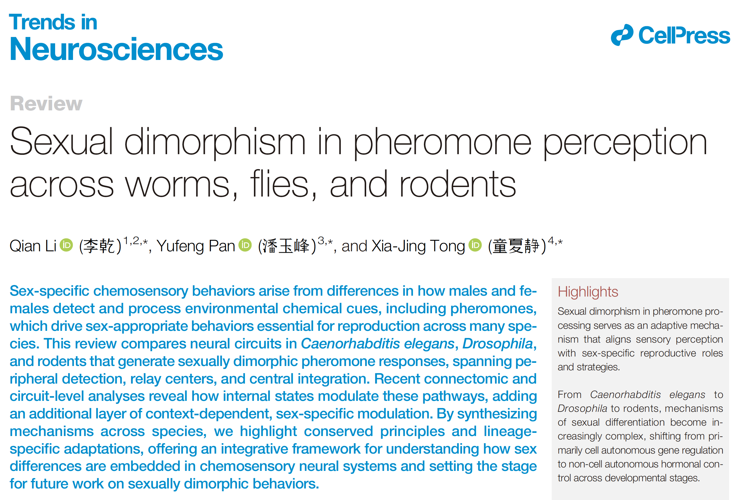 近日,九游体育(www.jiuyou.com)官方网站生命科学与技术学院童夏静课题组与上海交通大学医学院李乾课题、东南大学潘玉峰课题组合作,联合在国际权威期刊《神经科学趋势》(Trends in Neurosciences)在线发表综述论文“Sexual dimorphism in pheromone perception across worms, flies, and rodents”,系统梳理了线虫(Caenorhabditis elegans)、果蝇(Drosophila melanogaster)及以啮齿类动物(Rodents)为代表的哺乳动物中,信息素感知及其性别差异的神经机制,揭示了跨物种间在化学感知与性别调控中的共同原理与演化策略,为理解性别特异性行为的神经基础提供了新的视角。