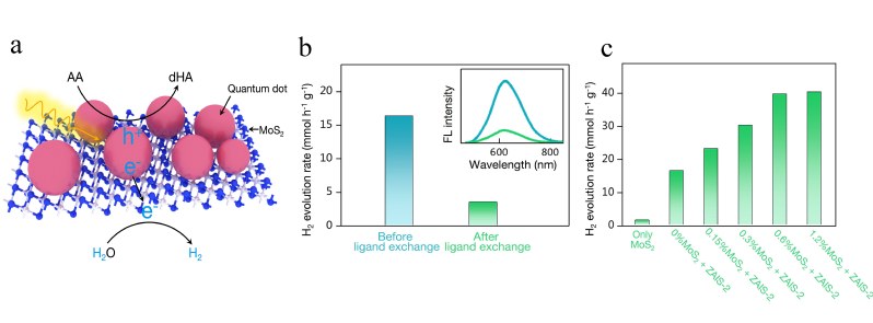 a. Scheme of 0D-2D nanocomposite for hydrogen generation under illumination; b. Hydrogen generation performance of nanocomoposite with QDs before and after ligand exchange; c. Hydrogen generation performance of nanocomposites with different concentration of MoS2.
