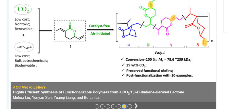 Polymeric materials based on petroleum industry are one of the most important material foundations of modern socio-economy. Five of the current “big six” synthetic polymers are made from olefins via C-C bond formations. Developing sustainable alternatives represents a major challenge in current polymer industry. CO2 is a highly attractive renewable C1 chemical feedstock, due to its abundance, availability, recyclability, and non-toxicity. Making polymers from CO2 , especially copolymerization of CO2 and olefins, has been long sought by numerous polymer chemists.As one of the important components in the C4 fraction of oil cracking, 1,3-butadiene can also be derived from succinic acid, which is ranked as one of the top 12 biomass platform compounds best suited to replace petrochemicals. Thus, chemistry leading to polymers made from CO2 and large-volume dienes, especially 1,3-butadiene, is of significant fundamental interest and promising large-scale industrial utility. 1,3-Butadiene could react with CO2 to produce a lactone efficiently via C-C bond coupling. Polymerization of the lactone has long been considered as one of the most promising avenues to make copolymers from CO2 and olefins. Though researchers tried the polymerization of the lactone about twenty years ago, only one success has been achieved with relatively low conversions under the assistance of metal additives and complex radical initiators. Lin’s research group developed an additive/solvent-free bulk polymerization method, leading to a quantitative monomer conversion (up to 100%) and polymers with molar mass up to 239 kDa as well as high contents of CO2 (29 wt %) and preserved functional olefins of the obtained polymer (poly-L). Through detailed mechanistic studies, it was found that oxygen, commonly considered as a radical inhibitor, acted as an initiator in the system. Possible initiation mechanisms were proposed based on the unique polymer structure.