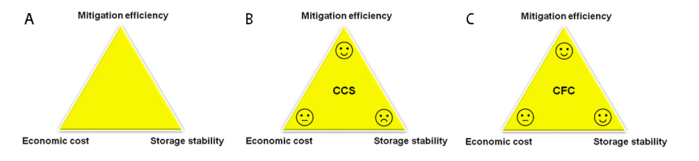 The authors estimate that without immediate worldwide action, the remaining carbon budget will very likely run out in ca. two decades, based on synthetic analysis of available data, particularly current global CO2 emissions ca. 41 gigatonnes annually with growing trend and the remaining carbon budget only ca. 800 gigatonnes to meet the temperature-control target in 2016 according to Intergovernmental Panel on Climate Change (IPCC), Energy Information Administration (EIA) of USA and The Global Carbon Project. A “golden triangle” with three key vertexes—“mitigation efficiency,” “storage stability,” and “economic cost”—is conceptualized for the first time as a qualitative principle to gauge the feasibility of various CO2 mitigation strategies. Extensive examination of available data, especially from the reports by International Energy Agency (IEA), suggests that aside from carbon capture and storage (CCS), chemical fixations of CO2 (CFC) with high “storage stability” can substantially abate CO2  emissions.