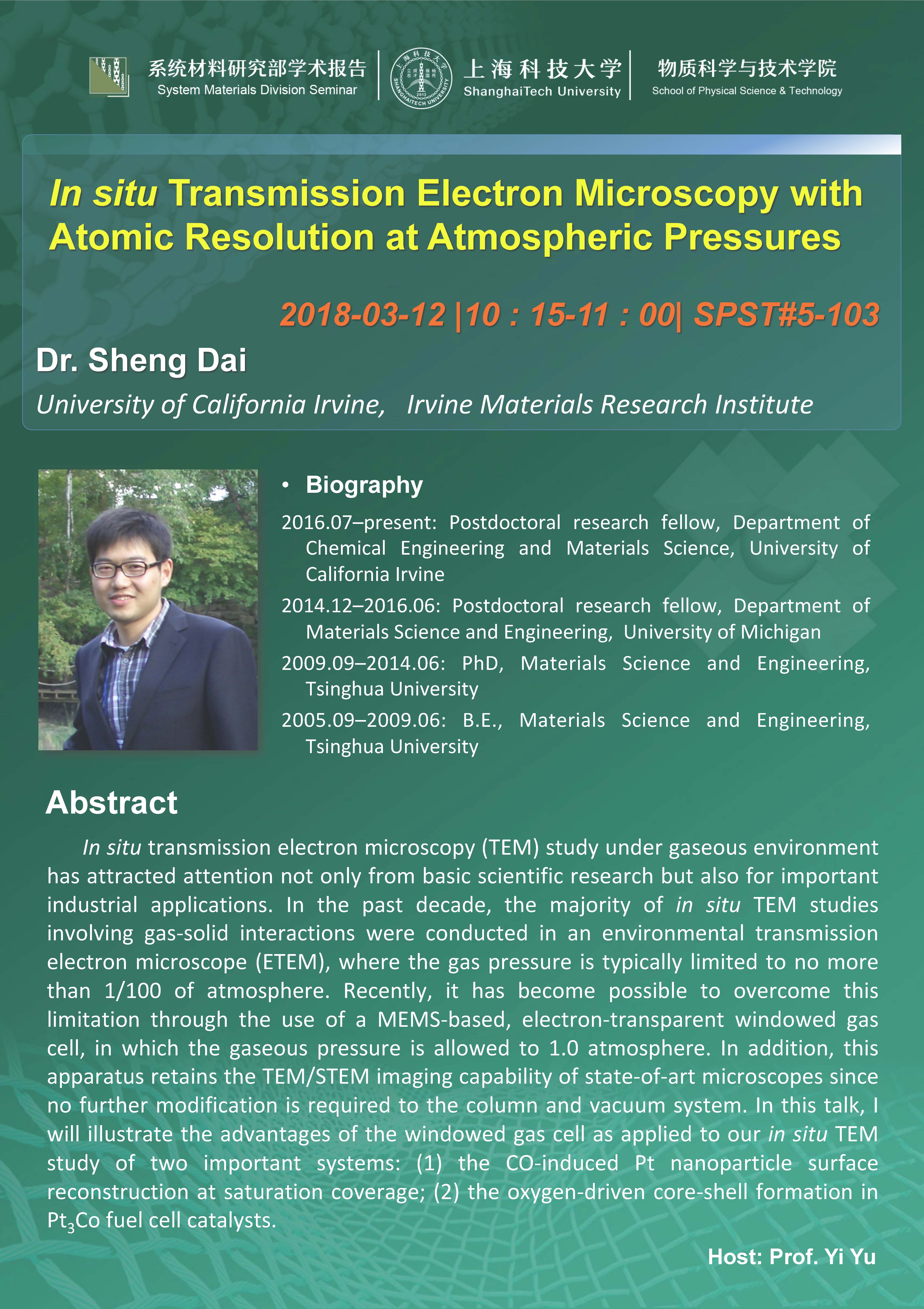 Topic:In situ Transmission Electron Microscopy with Atomic Resolution at Atmospheric Pressures