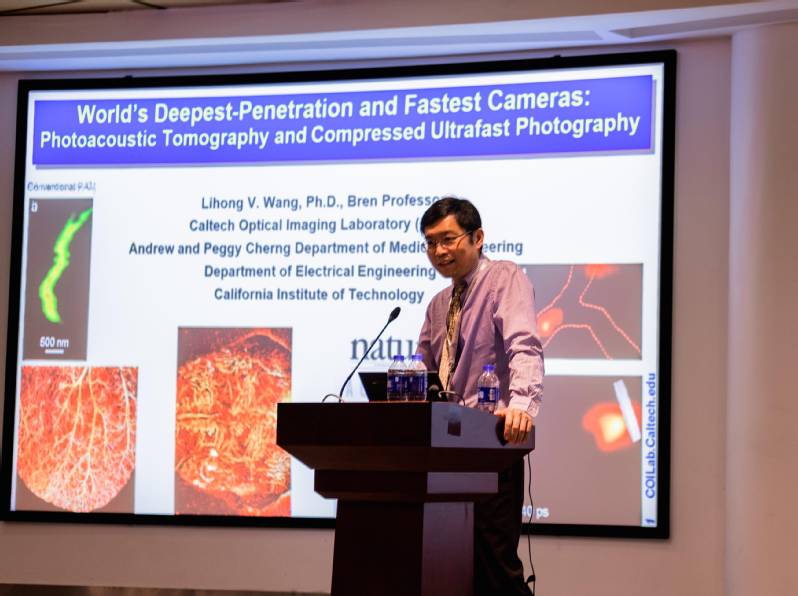 The academic program of the workshop began with the “Electromagnetic Imaging and Sensing” session and an informative keynote speech from Professor Lihong V. Wang.Professor Wang is currently the Bren Professor of Medical Engineering and Electrical Engineering at the Andrew and Peggy Cherng Department of Medical Engineering at CalTech. He is a member of the US National Academy of Engineering and a fellow of IEEE, OSA, SPIE, and AIMBE. In his presentation, he showed that the depth of photoacoustic tomography can be largely enhanced by wavefront shaping technique to obtain information deep inside biological samples, beyond the ability of conventional photoacoustic imaging. The most impressive images Professor Wang exhibited were several photoacoustic images obtained from volunteer patients, which clearly depicted complicated blood vessels and tumors inside human breasts with proper depth information labeled in different colors. He also shared us the latest progress on the fastest camera in the world developed by his group using compressive sensing technique. Several attractive animations illustrated the interaction of light with matters captured by this magic camera, such as reflection, refraction, racing of light beams in two materials, absorption, and optical Mach cone. A junior student Sun Yifei from SIST raised a very technical question to Professor Wang regarding the comparison of several parameters of photoacoustic imaging and thermoacoustic imaging. Professor Lalita Udpa (IEEE fellow) from Michigan State University showed their work on utilizing perfect microwave metamaterial lens for super-resolution near-field imaging and detection. Professor Song Liang from Shenzhen Institutes of Advanced Technology shared their latest work on multimode modality integrating photoacoustic imaging, fluorescent imaging, and ultrasound imaging. Professor Zheng Yuanjin from Nanyang Technology University talked about low-frequency electromagnetic-acoustic imaging mechanism and measurement of blood oxygen and blood glucose by photoacoustic sensors. Professor Nie Liming from Xiamen University discussed his research on photoacoustic tomography of animal heart in vivo.