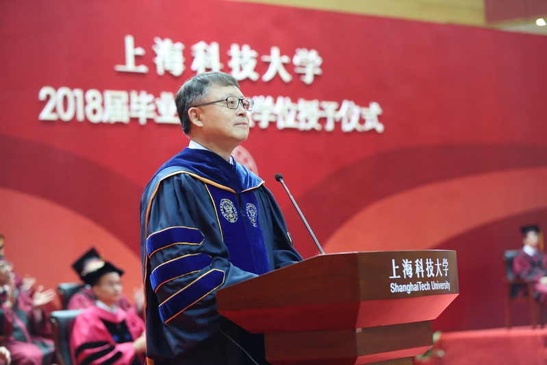 After a video made by the undergraduate class of 2018 shared memories from their years at ShanghaiTech, the ceremony began in earnest. President Jiang Mianheng took to the podium to address the graduating students. He congratulated them on their achievements and then reviewed ShanghaiTech's initiatives to closely link education and research. Jiang urged the students to take responsibility and work to effect positive change, not only for themselves, but also for the nation's development. He told the students how much he appreciated their trust and understanding in choosing ShanghaiTech during its initial stages of development and expressed his pride in all of their achievements. He also expressed gratitude for the support of Shanghai Municipal Government, CAS institutes, faculty and staff, as well as all those who care about the development of ShanghaiTech.