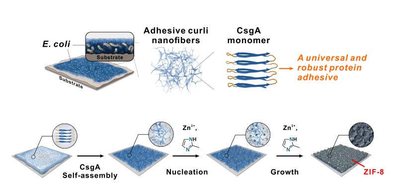 In nature, the biofilm of Escherichia coli (E. coli) can tightly anchor on many biotic and abiotic substrate surfaces to protect the bacteria from environmental changes. This superior adhesive capability can be attributed to numerous CNFs self-assembled from CsgA protein secreted by E. coli. Inspired by this phenomenon, two research groups used purified CsgA protein as a universal coating for a variety of polymeric substrates. Meanwhile, the remaining carboxylate, amino and imidazolate groups presented on the protein surfaces served as nucleation centers for crystalline MOFs to grow.