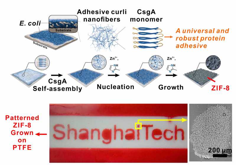 Research groups led by Professor Li Tao and Zhong Chao from the School of Physical Science and Technology (SPST) at ShanghaiTech University have co-developed a method that can grow metal-organic frameworks (MOFs) on nearly any polymeric surfaces using bacterial adhesive curli nanofibers (CNFs) as a mediator. Their work, "Adhesive Bacterial Amyloid Nanofibers-Mediated Growth of Metal-Organic Frameworks on Diverse Polymeric Substrates" was recently published in Chemical Science, a top chemical journal. The first author, Zhang Cuizheng, is a junior undergraduate student from Professor Li Tao's group. Li Yingfeng. the co-first author, is a 5th year graduate student from Professor Zhong Chao's group. Professors Tao Li and Chao Zhong are both corresponding authors of this paper.