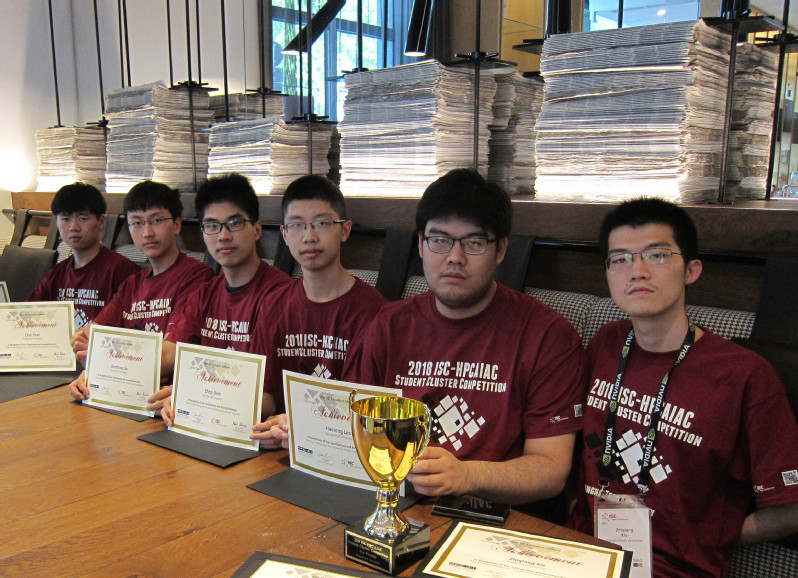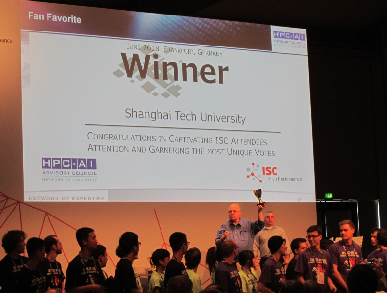 ISC-2018 Student Cluster Competition(ISC-SCC) announced the final results on June 27th local time at Frankfurt am Main, Germany. ShanghaiTech University team GeekPie_HPC won the Fan Favorite Team award. In addition, GeekPie_HPC team achieved the highest scores for HPCG Benchmark and AI application. Nearly three hundred teams from all over the world took part in the ISC-SCC this year, and 12 teams coming from nine different countries qualified for the ISC-SCC final. This GeekPie_HPC’s first time to participate at ISC. Made up five students ( Yuan Wei Jun, Liu Jian Zhong, Shen Ji Qi, Luo Huo Cong, Xie Zhi Qiang) the team was invited to the ISC-SCC final directly as the silver medal winner of ASC-2018.