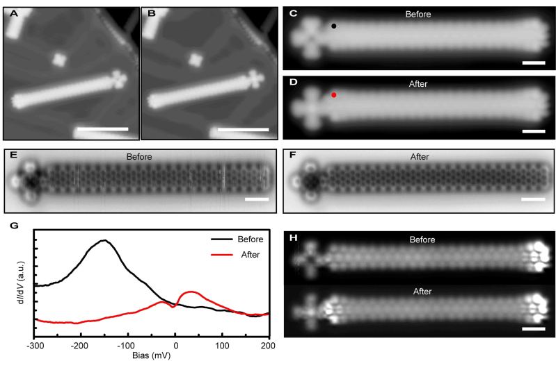 In this study, the MnPc molecule is fused with the zigzag edge of 7-armchair Graphene Nanoribbons using an on-surface synthesis method. Using high resolution scanning tunneling microscope (STM) and atomic force microscopy (AFM), researchers observed the covalent bonding in MnPc and graphene nanoribbon junction, and the zigzag edge state of the graphene nanoribbons have energy splitting with MnPc fusing (shown in Figure 1);Moreover, the edge states of graphene nanoribbons can be successfully engineered through hydrogen atom adsorption and desorption (shown in Figure 2). In order to illustrate the physical mechanism of this phenomenon, Kelvin force spectrum (KPFS) measurements and the DFT calculations were performed. The results suggest that the electronic structure of the zigzag edge state is engineered through tuning the local doping of graphene nanoribbon edges upon the charge transfer process. The results have paved a new way for the preparation of functional graphene devices.