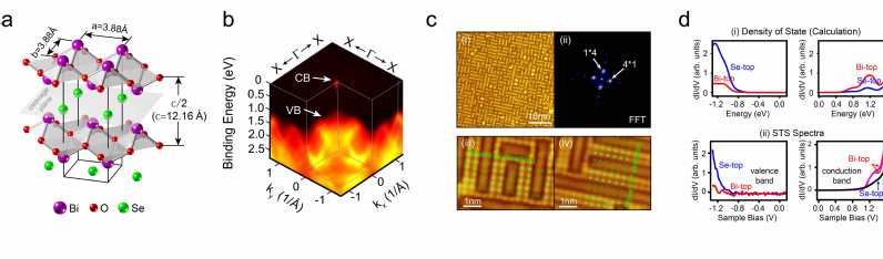 Figure 1. a. Layered crystal structure of Bi2O2Se. b. 3D band structures showing the conduction band (CB, valance band) and the band gap. c. Surface topography of Bi2O2Se with atomic resolution and the distribution of Se-defects. d. Comparison of the density of states (DOS) between experiments and calculations.