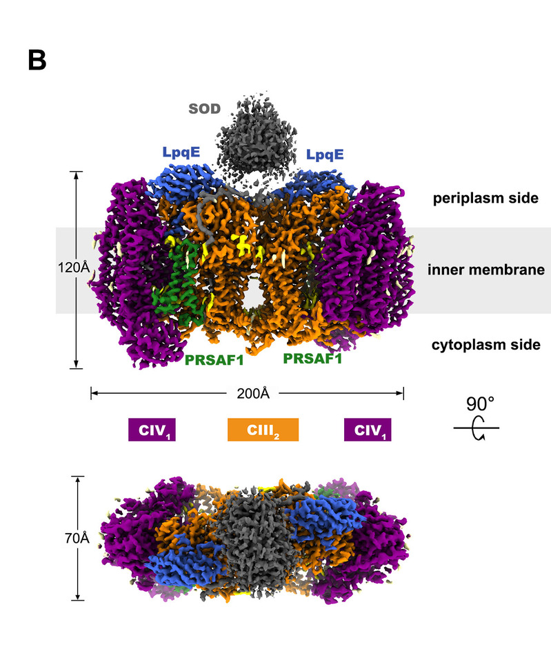 On the strength of cryo-electron microscopy (cryo-EM) with high resolution (3.5 Å) structure of mycobacterial respiratory supercomplex, the team revealed a new electron transfer mechanism coupling quinone oxidation with oxygen reduction. Furthermore, they discovered that superoxide dismutase (SOD) are directly involved in the assembly of the supercomplex and work in concert. These new findings have laid a solid groundwork for new drug R&D targeting tuberculosis, which poses grave threats on human health.