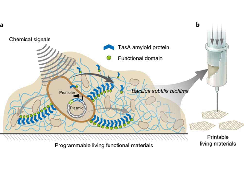 Bacterial biofilms are microorganism communities encased in their secreted extracellular matrix, including proteins, exopolysaccharides, and DNAs. Previously, researchers have explored E. coli biofilms for the design of living functional materials exhibiting many attractive attributes including genetic programmability, configurable functions, and environmental responsiveness. However, E. coli export machinery’s inability to secrete large proteins significantly reduces the scope of possible material functionality. In addition, difficulties with the controlled processing of such complex materials into customizable 3D structures with well-defined designed geometries also impede their practical application. Last but not least, considering that these materials are living, and given the potential risks that live bacteria present to human beings and the environment, it is now recognized that in addition to using bacterial species that are considered safe, the careful packaging of such materials into confined environments is a particularly important and necessary design element. To address these issues, the researchers sought to utilize Bacillus subtilis, a “generally regarded as safe” (GRAS) gram-positive aerobic bacterium containing only one outer membrane, as a host to design living functional materials.