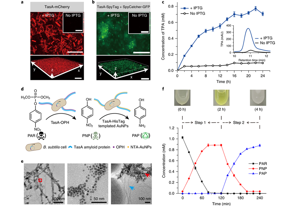 The researchers first leveraged genetic engineering to develop programmable TasA fusion proteins containing a variety of functional domains or proteins that are rationally fused at the C-terminus of TasA amyloid protein (the major protein of the B. subtilis biofilm matrix). These fusion proteins could be secreted extracellularly, self-assembled into nanofibers and exhibited new functional properties as designed. As a proof-of-concept application, this programmable platform could be used for multistep reactions (i.e., biocatalytic cascades) to degrade organo-phosphate pesticides into harmless chemicals. To such ends, they chose a two-step cascade consisting of (i) the organophosphate hydrolase (OPH)-catalyzed degradation of the pesticide paraoxon (PAR) into the less harmful intermediate product paranitrophenol (PNP), and (ii) a reaction catalyzed by HisTag-immobilized gold NPs (AuNPs) in which PNP is further degraded into harmless p-aminophenol (PAP).