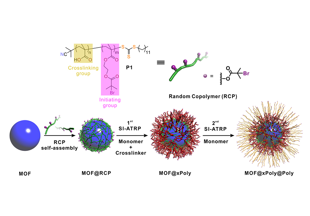 To overcome current challenges, Li Tao's research group developed a surface-initiated atom transfer radical polymerization (SI-ATRP) method for the growth of polymers on various MOFs materials’ surface, which is based on the self-assembly of a designed random copolymer (RCP) on the surface via weak interaction. In this research, they first designed an RCP containing multiple carboxylic acid groups and initiation sites (bromoisobutyrate, BiB) of ATRP along the polymer chain. Then this RCP was self-assembled onto MOF surfaces through inter-chain hydrogen bond crosslinking accompanied by weak MOF/polymer interactions to immobilize the initiation site on MOF surface. The SI-ATRP was performed subsequently in the presence of monomer and crosslinking monomer, and a layer of covalently crosslinked polymer with uniform thickness can be coated on the surface of MOF. Utilizing the reversible-deactivation feature of ATRP, a second and even a third layer of polymer (linear or crosslinked) can be subsequently grown from the first layer, thus the composition, sequence and architecture of polymer layer on the surface of MOFs can be controlled arbitrarily. This method solves the long-standing problem of MOFs surface modification with polymers and makes the accurate synthesis and interface regulation of MOF and polymer composites possible.