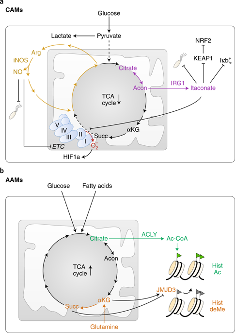 Top: Metabolism of macrophages in the classical activation, Bottom: Metabolism of macrophages in the alternative activation
