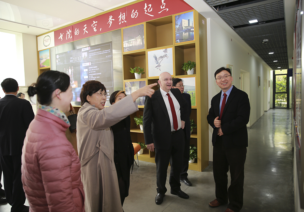 The two sides exchanged ideas on enrollment, teaching and research and expressed willingness to cooperate. Afterwards, the delegation toured around the campus, visiting some of the schools.