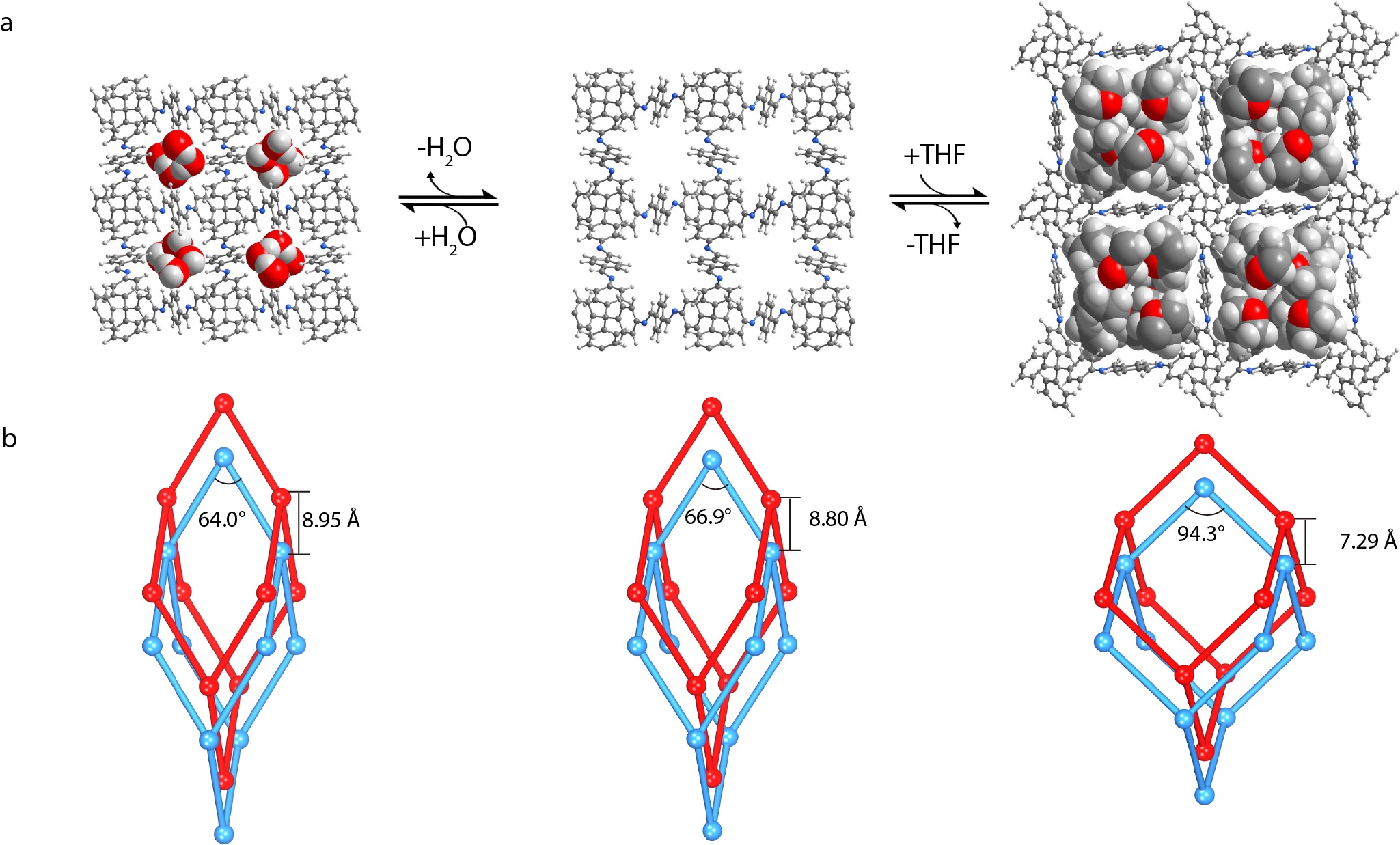Figure 2. Guest-dependent crystal contraction and expansion behavior of COF-300 (a) and its difference of frameworks.