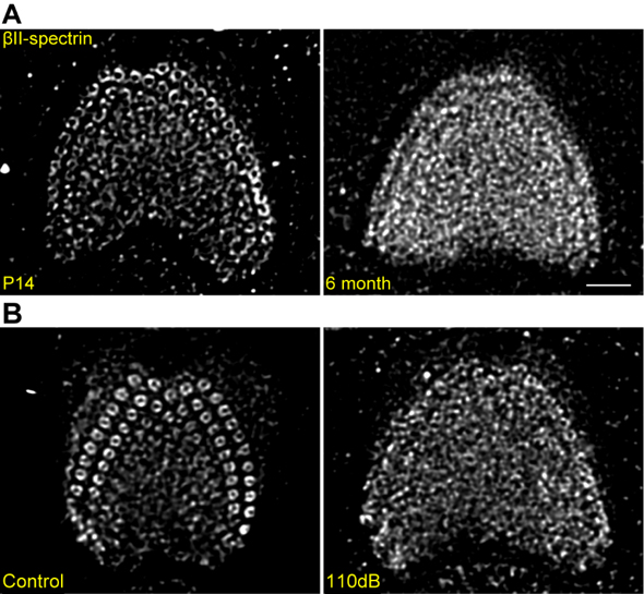 By utilizing stimulated emission depletion (STED) imaging and multiple approaches, the novel ring-like structures of spectrin, have been revealed for the first time, wrapping around the base of stereocilia rootlets. These spectrin rings were found to be closely associated with the hearing ability of mice. HC-specific, βII-spectrin knockout mice displayed profound deafness.
