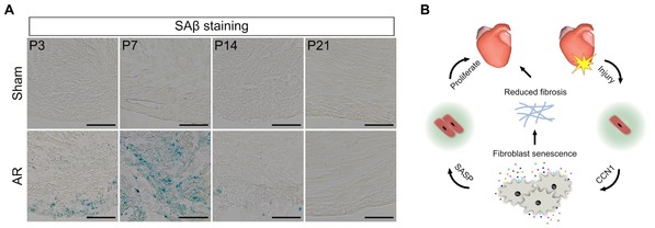 The researchers performed apical resection, a kind of heart injury, on neonatal hearts at postnatal day 1 and identified senescent cells in the injured regions in the following two weeks (Figure A). These senescent cells disappeared when the injured hearts were fully restored at postnatal day 21 (Figure A). The researchers found that clearing the senescent cells or inhibiting the formation of cellular senescence both impaired neonatal heart regeneration, which means that cellular senescence is required for neonatal heart regeneration. Subsequently, the researchers found that fibroblasts, one of the major cellular types in heart, were senescent post injury and Trp53 signaling pathway was required for fibroblast senescence and neonatal heart regeneration.