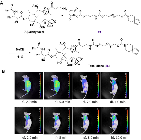 Figure 2. In vivo fluorescence imaging. A. Synthesis of diene‐bearing taxol. B. NIR images of living ZR‐75‐1 breast tumor model mice after tumor local injection of nitroso‐diene probe at different time points: a,b) Control fluorescence imaging for injection of fluorogenic probe pairs: the nontargeted diene (20) and 9 at 2.0 and 5.0 min points. c) Control fluorescence imaging for injection of taxol‐diene (26) at 2.0 min point. d–h) Fluorescence imaging for injection of fluorogenic probe pairs: taxol‐diene (26) and 9 at 1.0, 2.0, 5.0, 8.0, and 10.0 min points.
