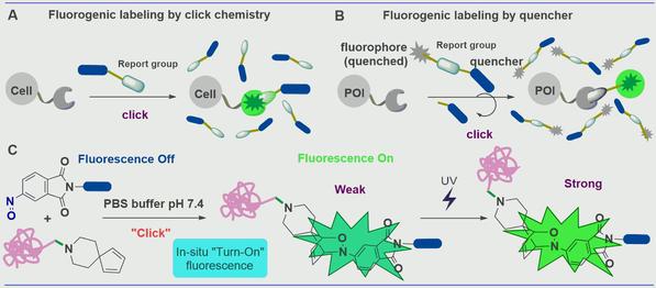 By leaving free fluorophore untouched, fluorogenic labeling can minimize background signal when labeling protein of interest (POI). In the present study, Dr. Liu Jia and Jiang Biao Laboratories teamed up with collaborators to develop a highly efficient, bioothogonal nitro-based Diels-Alder (nDA) reaction for in vitro and in vivo fluorogenic labeling in cells. By UV light activation, the fluorescence of the nDA reaction can be further enhanced, thus allowing for the temporal control of fluorogenic reaction.