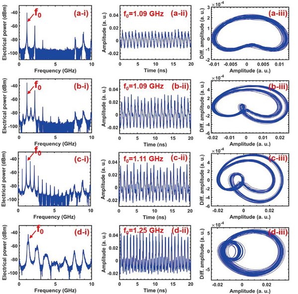 Figure 1. Electrical spectra (left), time series (middle), and phase portraits (right) at different pump currents. (a) and (d) are period-one oscillations, (b) and (c) are period-two oscillations.