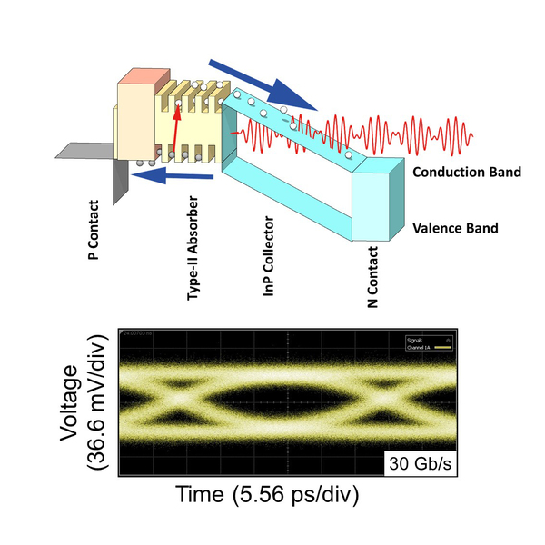 With the rapid development of information, the single fiber capacity of the existing 1550nm optical communication system has gradually approached its theoretical limit. The optical communication system at 2-micron wavelength has become the major developing direction for the next-generation optical communication system. High speed photodetectors working at 2-micron wavelength band are an essential component of the 2-micron optical communication system. Chen Baile's group proposed and demonstrated the uni-traveling carrier photodetector with InGaAs/GaAsSb type-II multiple quantum wells absorption region based on InP substrate. This photodetector has very low dark current and high bandwidth. It overcomes the current issues of the existing detector technologies at 2-micron waveband, such as large dark current, difficult material growth and low bandwidth. This work provides a high-performance component for high speed optical communication systems in the 2-micron waveband.