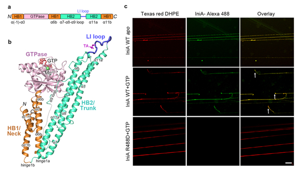 IniA is an important isoniazid inducible protein in Mycobacteria, relating to the drug resistance of isoniazid and ethambutol. But its structure, function and mechanism for drug resistance remain to be illustrated. In this study, the researchers solved the crystal structures of Mycobacterium smegmatis IniA in the apo and GTP bound states. The structures reveal that IniA folds as a bacterial dynamin-like protein (BDLP) with a canonical GTPase domain followed by two helix-bundles (HBs), named Neck and Trunk. The distal end of its Trunk domain exists as a lipid-interacting (LI) loop, which binds to negatively charged lipids for membrane attachment. IniA does not form detectable nucleotide-dependent dimers in solution. However, lipid tethering indicates nucleotide-independent association of IniA on the membrane. Further biochemical experiments show that IniA deforms membranes and exhibits GTP-hydrolyzing dependent membrane fission. The molecular activity of BDLP family has been controversial for a long time, because of its similarity with Mitofusion in mitochrondria on structure folding and phylogeny, the BDLPs have been thought to mediate membrane fusion. This work now clearly elucidates the ability of BDLP in membrane fission rather than fusion.