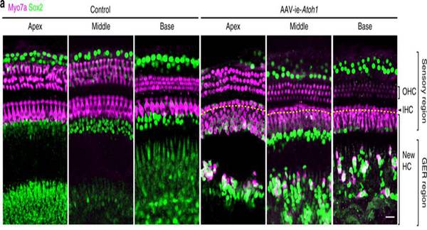 Round window membrane (RWM) injection of AAV-ie is safe, as indicated by well-preserved HCs and hearing function. Further, after delivering Atoh1 gene into mouse cochlea by AAV-ie, many new HCs are generated, indicating the potential of the AAV-ie vector for HC regeneration (Fig. 2).