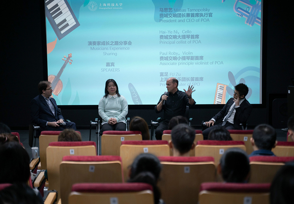 On the evening of November 12th, performers from Philadelphia Orchestra directed the ShanghaiTech Student Orchestra; they had friendly dialogues with students and even performed with students. At noon of November 13th, musicians from Philadelphia Orchestra and Shanghai Philharmonic Orchestra shared their growing-up experiences with students in School of Creative and Art’s screening room. The audience asked many questions including how artists communicate with scientists. When asked about innovating traditional music, Philadelphia Orchestra Director and CEO Matias Tarnopolsky answered that they hope to cooperate with more international partners like ShanghaiTech University, and always use collaboration to ask, learn and innovate.
