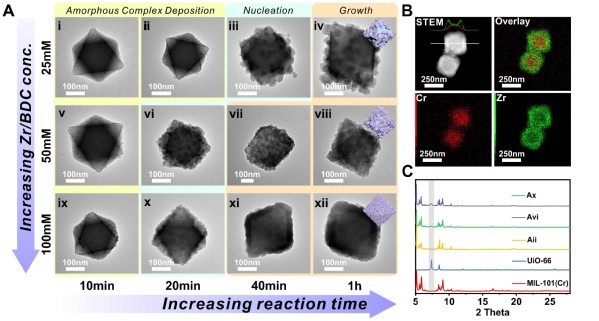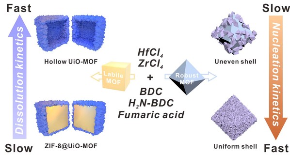 Here, two kinetic factors, nucleation kinetics and dissolution kinetics, are revealed to be two keys to overcoming this challenge. Through kinetic control, Li Tao’s research group demonstrated the growth of four types of Zr/Hf-MOF shells uniformly and contiguously on seven different core MOFs. Through a set of controlled experiments they discovered for the first time that fast nucleation kinetics during heterogeneous nucleation reactions was key to facilitating uniform shell growth to form high-quality core-shell MOF materials. In addition, they also discovered that when labile MOF materials (ZIF-8 in this study) were used as core, the dissolution kinetics of core is another key parameter that determines the successful growth of the shell. Through systematic control of the dissolution rate of ZIF-8 seeds during the shell growth process, different morphologies (hollow shell, yolk-shell, and core-shell) can be accessed. The authors further demonstrated that the MOF shells can serve as a bridging layer for secondary modification of MOF surfaces, which can significantly impact the catalytic properties of metal nanoparticle-MOF composites. This work is a major step forward for the design and synthesis of complex multifunctional MOF composites for various applications.
