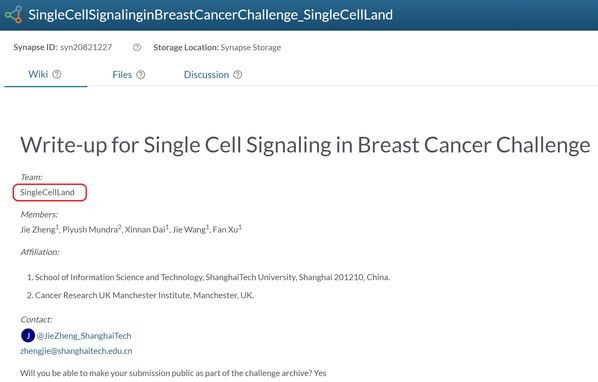 DREAM 2019 Challenge organizers recently announced competition and the ShanghaiTech team from SIST named “SingleCellLand” won the Third Place (out of 291 teams worldwide) in the first sub-challenge. The team was guided by Professor Zheng Jie, the director of SIST’s Smart Medical Information Research Center (SMIRC). Other team members include Professor Zheng’s master’s degree students Dai Xinnan and Wang Jie (enrolled in 2019), and undergraduate student Ms. Xu Fan (who will start her master’s degree study at SIST in 2020). Another team member was Dr. Piyush Mundra from the University of Manchester (UK) a former postdoct fellow with Professor Zheng.