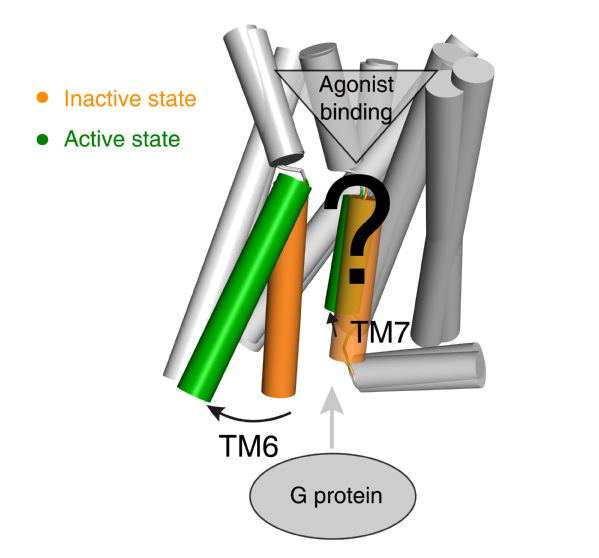 G protein-coupled receptors (GPCRs) influence virtually every aspect of human physiology and are important drug targets with 475 marketed drugs (~34% of all FDA approved therapeutic agent agents). GPCR activation is an allosteric process transducing various external stimuli into cellular responses agonist binding induced G protein recruitment. Understanding the activation mechanism of GPCR is of paramount importance in pharmacology research and drug discovery. It is well established that outward movement of transmembrane helix 6 (TM6) upon ligand binding is a common feature of receptor activation, but the residue level changes that trigger the movement of TM6 remain less understood (Fig. 1).