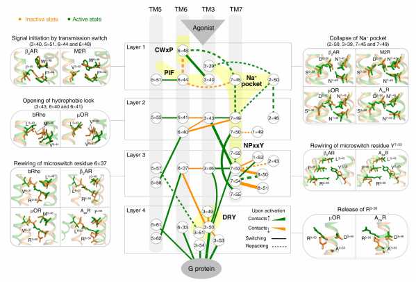 Using a residue-residue contact score (RRCS)-based framework, Professor Zhao and colleagues quantified the global, local, major and subtle conformational changes in a systematic way (i.e., inter-helical and intra-helical, switching and repacking contacts). By analyzing the conformational changes in 234 structures from 45 class A GPCRs, they discovered a common GPCR activation pathway comprising of 34 residue pairs and 35 residues (Fig. 2). The pathway unifies previous findings into a common activation mechanism and strings together the scattered key motifs such as CWxP, DRY, Na+ pocket, NPxxY and PIF, thereby directly linking the bottom of ligand-binding pocket with G protein coupling region. Collectively, the intra-helical/inter-helical and switching/repacking contacts between residues is not only critical to reveal the continuous and modular nature of the activation pathway, but also to link residue-level changes to transmembrane helix-level changes in the receptor.