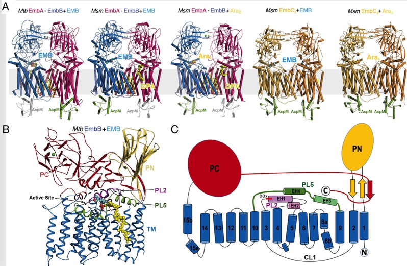 Figure Legend: (A) Structures of Mycobacterium tuberculosis (Mtb) and Mycobacterium smegmatis (Msm) EmbA-EmbB-AcpM2 and EmbC2-AcpM2 in complex with substrates (Ara2, DPA) and drug ethambutol (EMB); (B) Domains and structural features of Emb proteins, represented by Mtb EmbB; (C) Topological diagram of Emb proteins
