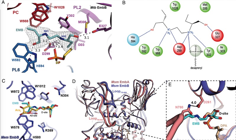 Mtb has a complex cell wall compared to Gram-negative and Gram-positive bacteria. Its core structure, mycolyl-arabinogalactan-peptidoglycan (mAGP), is composed of three highly unusual elements covalently linked together: (i) long-chain mycolic acids (MA), (ii) a highly branched arabinogalactan (AG), and (iii) a cross-linked network of peptidoglycan (PG) and other key components such as lipoarabinomannan (LAM). The mycobacterial cell wall acts as a natural barrier surrounding the cell membrane. Inhibition of Mtb cell wall assembly is an established strategy for anti-TB chemotherapy, and the targeting of cell-wall biosynthesis is regarded as the mode of action of first-line drugs like ethambutol and isoniazide. The membrane-embedded Emb proteins, EmbA, EmbB and EmbC, which are involved in AG (EmbA/EmbB) and LAM (EmbC) biosynthesis are regarded as the targets of ethambutol. However, the molecular mechanism of ethambutol inhibition remains unclear, thus hindering the design of new-generation ethambutol-based drugs aimed at conquering drug resistance.