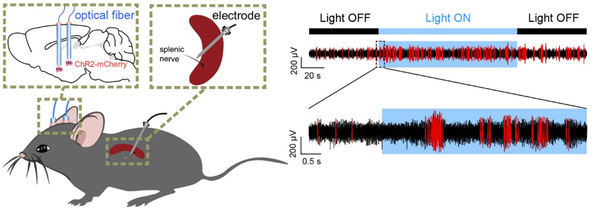 Optogenetic stimulation and electrophysiological records confirm that splenic nerve activity responds to central stimulation