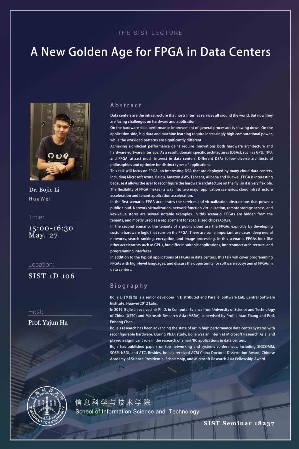 This talk will focus on FPGA, an interesting DSA that are deployed by many cloud data centers, including Microsoft Azure, Baidu, Amazon AWS, Tencent, Alibaba and Huawei. FPGA is interesting because it allows the user to reconfigure the hardware architecture on the fly, so it is very flexible. The flexibility of FPGA makes its way into two major application scenarios: cloud infrastructure acceleration and tenant application acceleration.