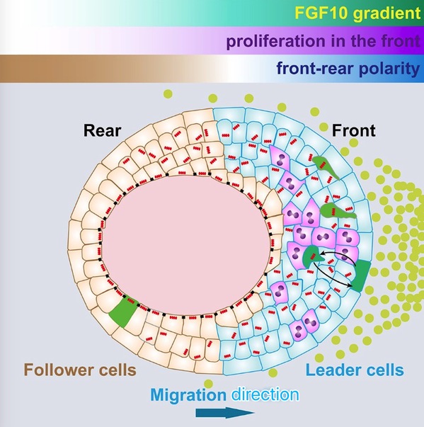 Despite some recent advances in the study of collective migration, little is understood regarding the mechanism by which vertebrate glandular epithelium undergoes directional migration. Based on Lu Pengfei group’s previous report that FGF10 can trigger directional epithelial migration, they can answer those two fundamental questions. The group found that mammary epithelium uses a novel mechanism both to set up directionality and to drive migration. Specifically, the front-rear polarity of mammary epithelium is established by asymmetric cell proliferation and epithelial stratification in an FGF10-gradient-dependent manner. Unlike all other known systems, “leader cells” have not been generated at this stage. Epithelial stratification in the front, which leads to tissue polarity loss, is required for directional migration. Lu Pengfei's group have shown that front cells are leader cells of directional migration and they move faster and more directionally. Compared to other collective systems, “leader cells” in the mammary epithelium are a dynamic rather than a stable population. The FGF10 gradient orients intra-epithelial protrusions toward the signal source so that the overall cell movements are cohesive and efficient. Finally, they show that instead of using a pulling force as in other collective models, “leader cells” power migration by a combination of both pulling and pushing forces. This work has opened a door to various new and exciting frontiers. It also provides a theoretical basis for understanding cancer metastasis, such as in the development of breast cancer, and provides insight into finding new therapeutic targets.
