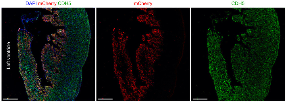 Lineage tracing experiments revealed that adult endocardium with overexpression of Kdr generated coronary blood vessels in normal hearts. mCherry indicates Kdr-overexpressing endocardium and endocardial-derived coronary endothelial cells. CDH5 indicates endocardial and coronal vascular endothelial cells.