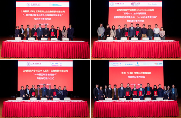 At the signing session of the event, ShanghaiTech signed patent license contracts with Hrain Biotechnology, Soma Biologics (U.S.), as well as Correct Sequence (Shanghai) Biotechnology-a start-up company derived from ShanghaiTech; Correct Sequence (Shanghai) Biotechnology then signed angel round investment agreements with Qingdao Wanwu Capital Investment, New Alliance Capital, Sequoia Capital, and TF Capital.