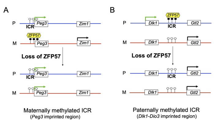 The regulated imprinted genes display parent-of-origin-dependent mono-allelic expression. Most imprinted genes are clustered and co-regulated by a cis-acting imprinting control region (ICR) in each imprinted region. In this study, Li’s group found that ZFP57 maintains DNA methylation imprint at most known ICRs. Mono-allelic expression of ZFP57 target imprinted genes is lost in Zfp57 mutant embryos. Instead, they become bi-allelic without ZFP57. The maternal alleles of some ZFP57 target imprinted genes will adopt similar expression patterns to those of their paternal counterparts upon loss of DNA methylation at the maternally methylated ICRs (e.g., Peg3 ICR) in Zfp57 mutant embryos (Fig. 1A). By contrast, the paternal alleles of some ZFP57 target imprinted genes will act like the maternal alleles when DNA methylation is lost at the paternally methylated ICRs (e.g., the IG-DMR of Dlk1-Dio3) in Zfp57 mutant embryos (Fig. 1B). This suggests there is an allelic expression switch of many ZFP57 target imprinted genes upon loss of DNA methylation at the ICRs without ZFP57.