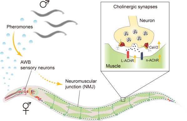 The team further discovered that male-specific pheromones mediate the synaptic transmission modulation effect. By dissecting sensory circuits in the worm, they discovered that AWB chemosensory neurons (similar to olfactory neurons in human) sense those male pheromones and then transduce information to the NMJ. While the AWB neurons are shared by both sexes, the male pheromones only excite AWBs in the hermaphrodites, but not in the males.