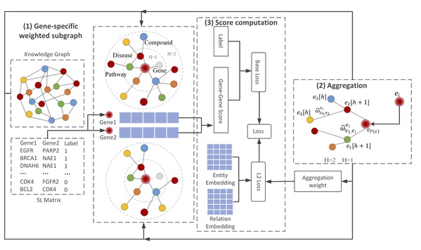 Figure 1. The framework of KG4SL. It is composed of three modules, namely Gene-specific weighted subgraph, Aggregation and Score computation. (1) Gene-specific weighted subgraph: For each SL gene pair, it constructs weighted subgraphs from the KG. (2) Aggregation: For each SL pair, it selects entities and relationships directly related to the nodes from the weighted subgraphs. Based on the assumption that the biological information can flow between nodes through edges, the information of indirectly connected entities and relationships are aggregated into feature representations of the genes. (3) Score computation: Applying a sigmoid function to the inner product of representations between two genes, it computes the probability of the two genes with SL relationship.