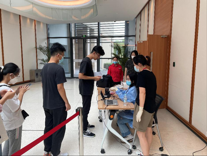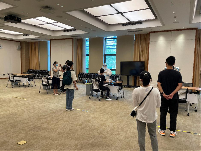 Before the registration, ShanghaiTech epidemic prevention group formulated campus entrance policies according to the requirements of their superior to ensure the freshmen’s safe enrollment. The Office of Student Affairs worked with the Office of General Services and various schools and colleges to formulate a work plan for newcomers, in advance of their arrival. For example, all freshmen were required to fill in an epidemic prevention questionnaire, upload itinerary details, health code, nucleic acid test report and vaccination code (if any), and carry out 14-day self-health observation before entering the campus. On the day of registration, the university arranged sufficient security personnel and volunteers to strictly check students, one by one, according to the name list, and take their body temperatures, at the school gate. After that, the university arranged for new students to do the nucleic acid test again on campus, and provided voluntary vaccination services for students who had not been vaccinated, so as to comprehensively protect campus security.