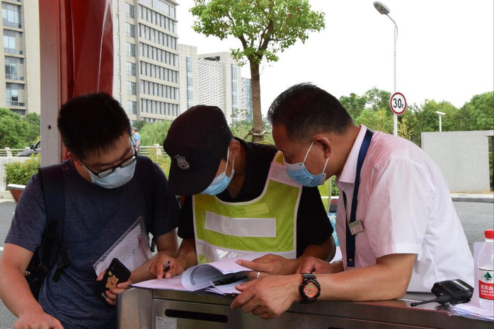 The security staff checking a student’s information at the school gate.